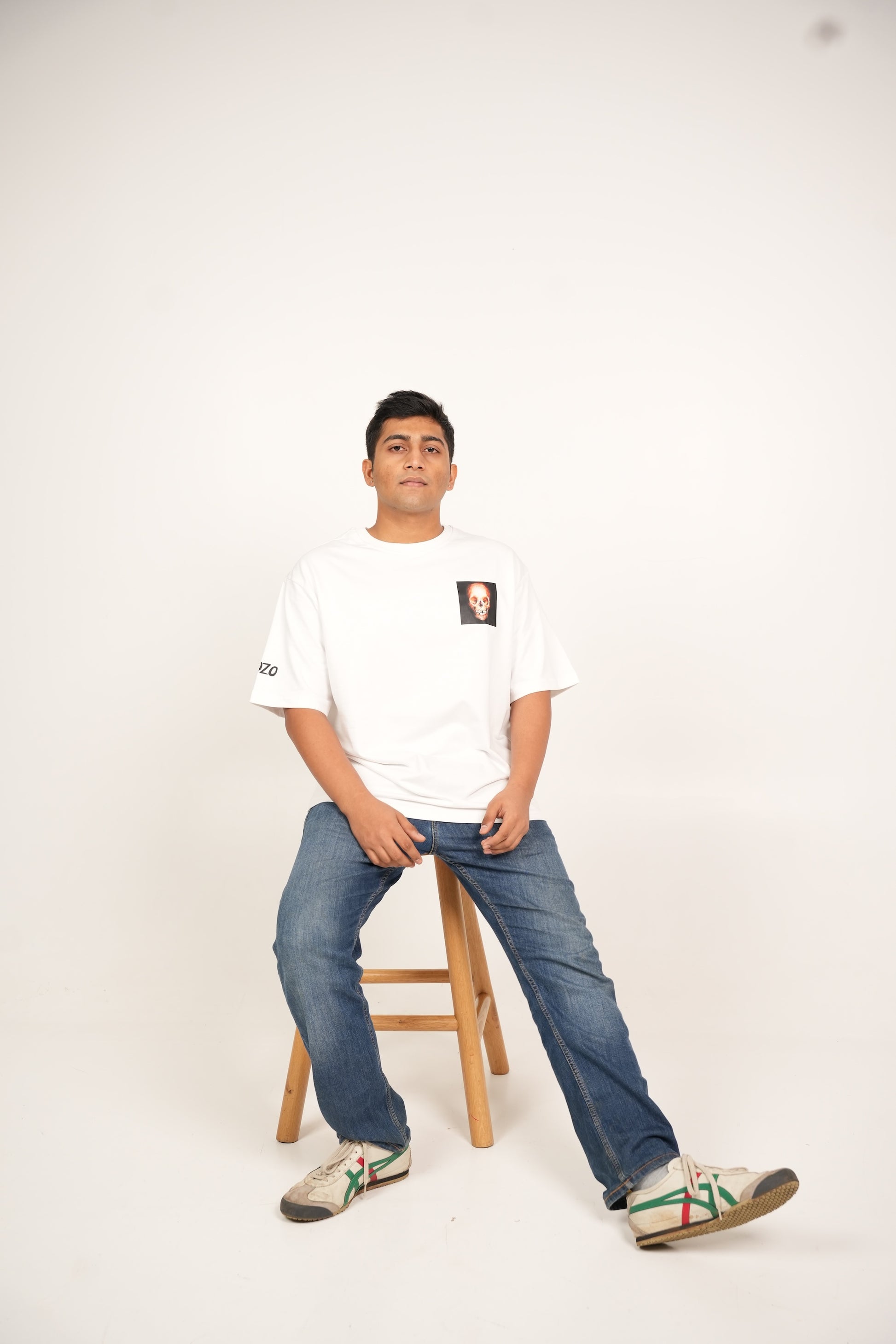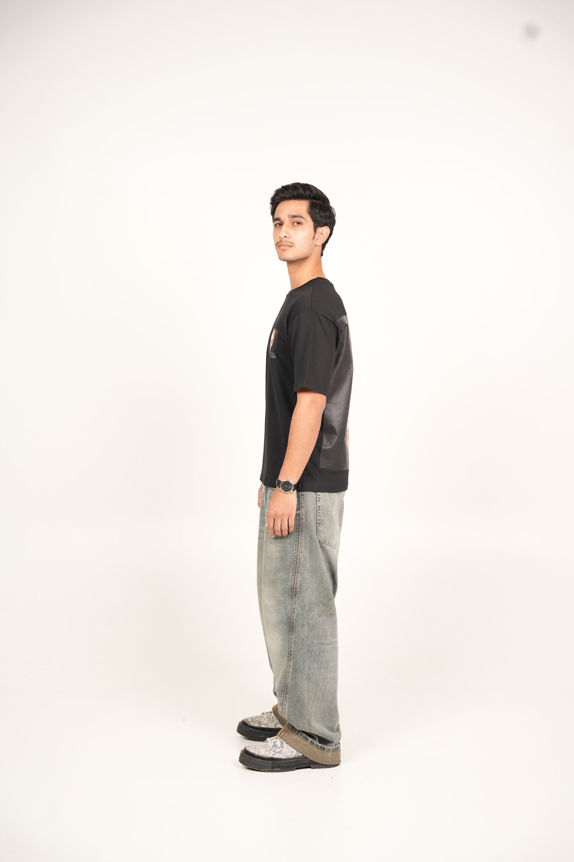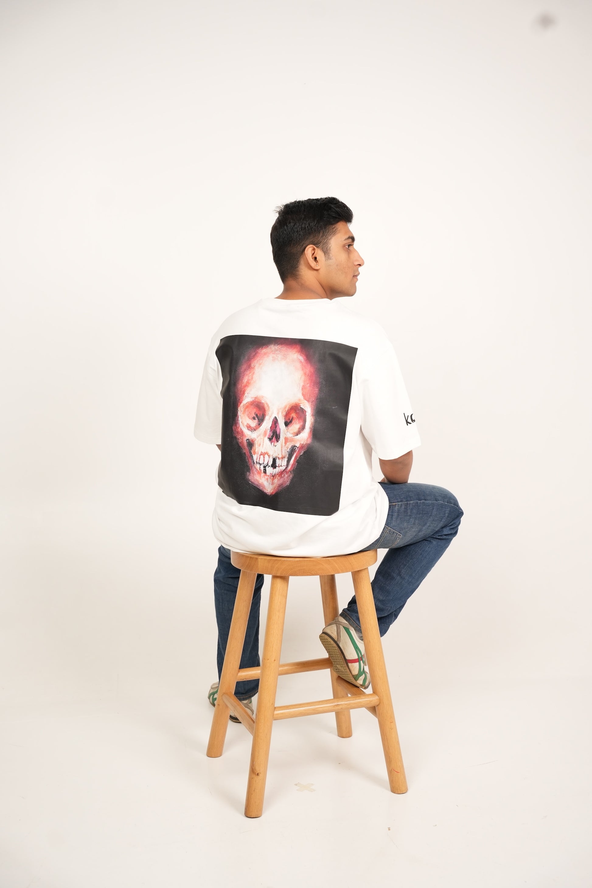 A hand-painted acrylic art piece with a prominent abstract design on an oversized fit t-shirt, with detailing on the front as well. Made with cotton, heavyweight and breathable.
