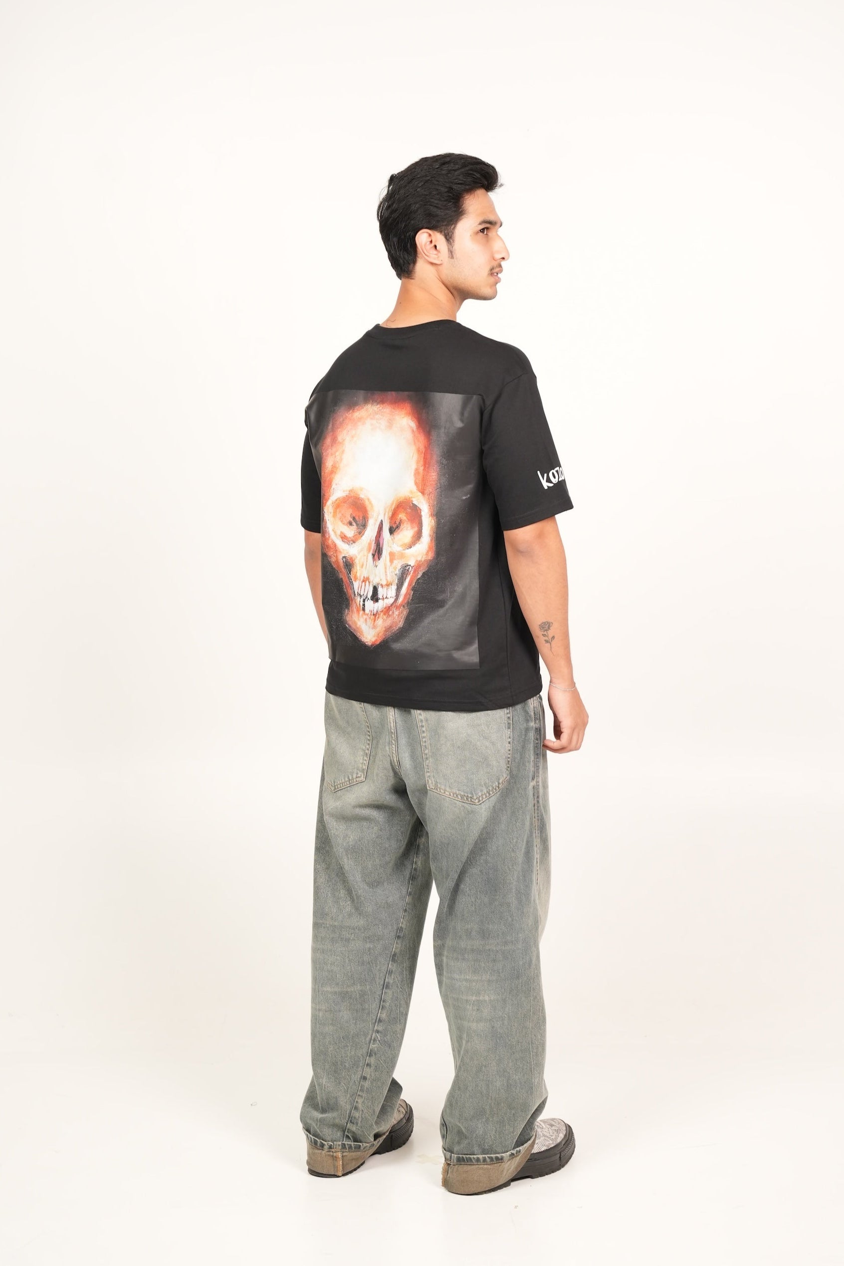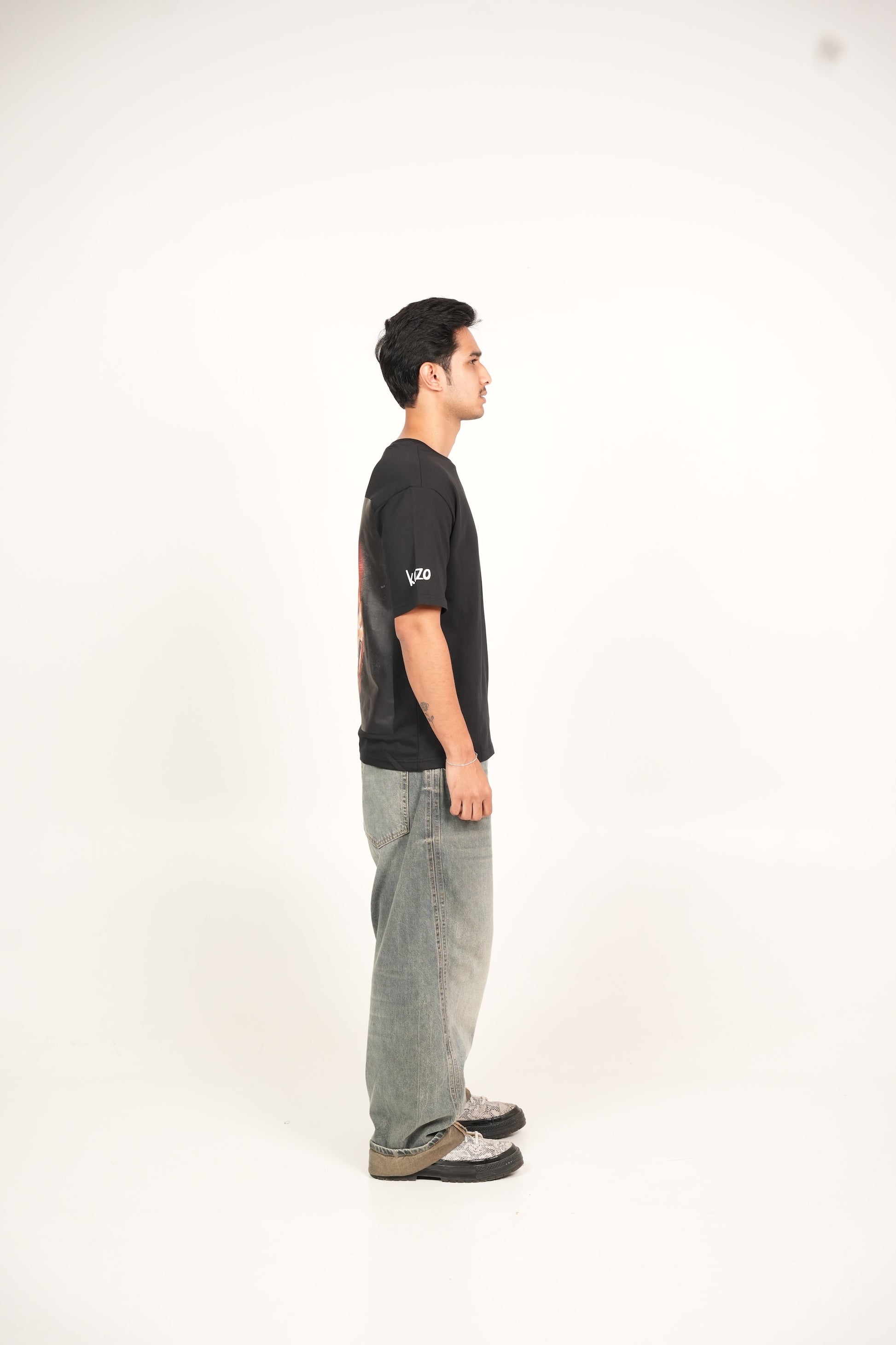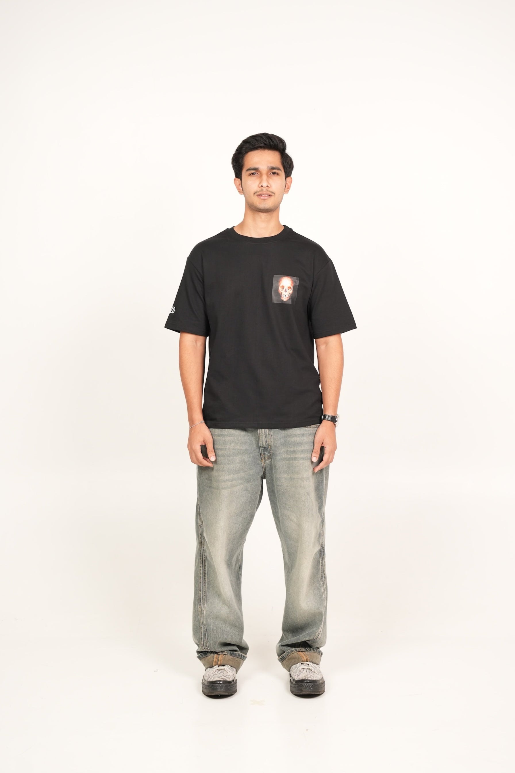 A hand-painted acrylic art piece with a prominent abstract design on an oversized fit t-shirt, with detailing on the front as well. Made with cotton, heavyweight and breathable.
