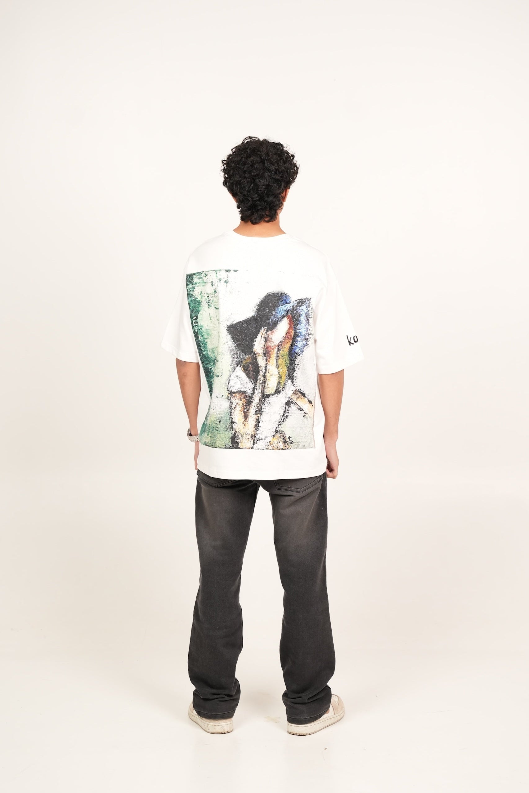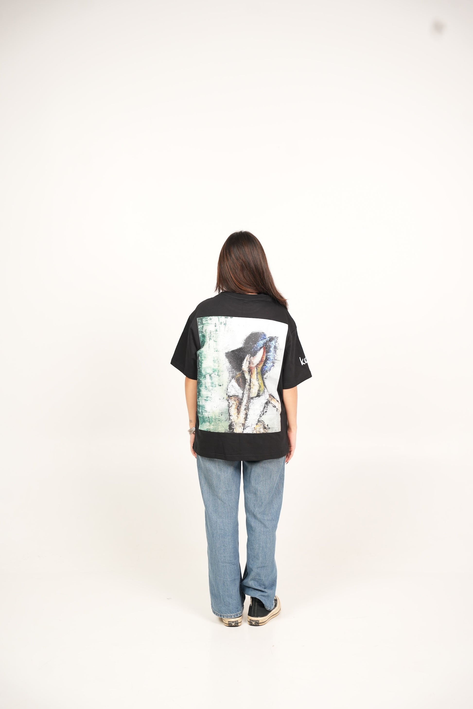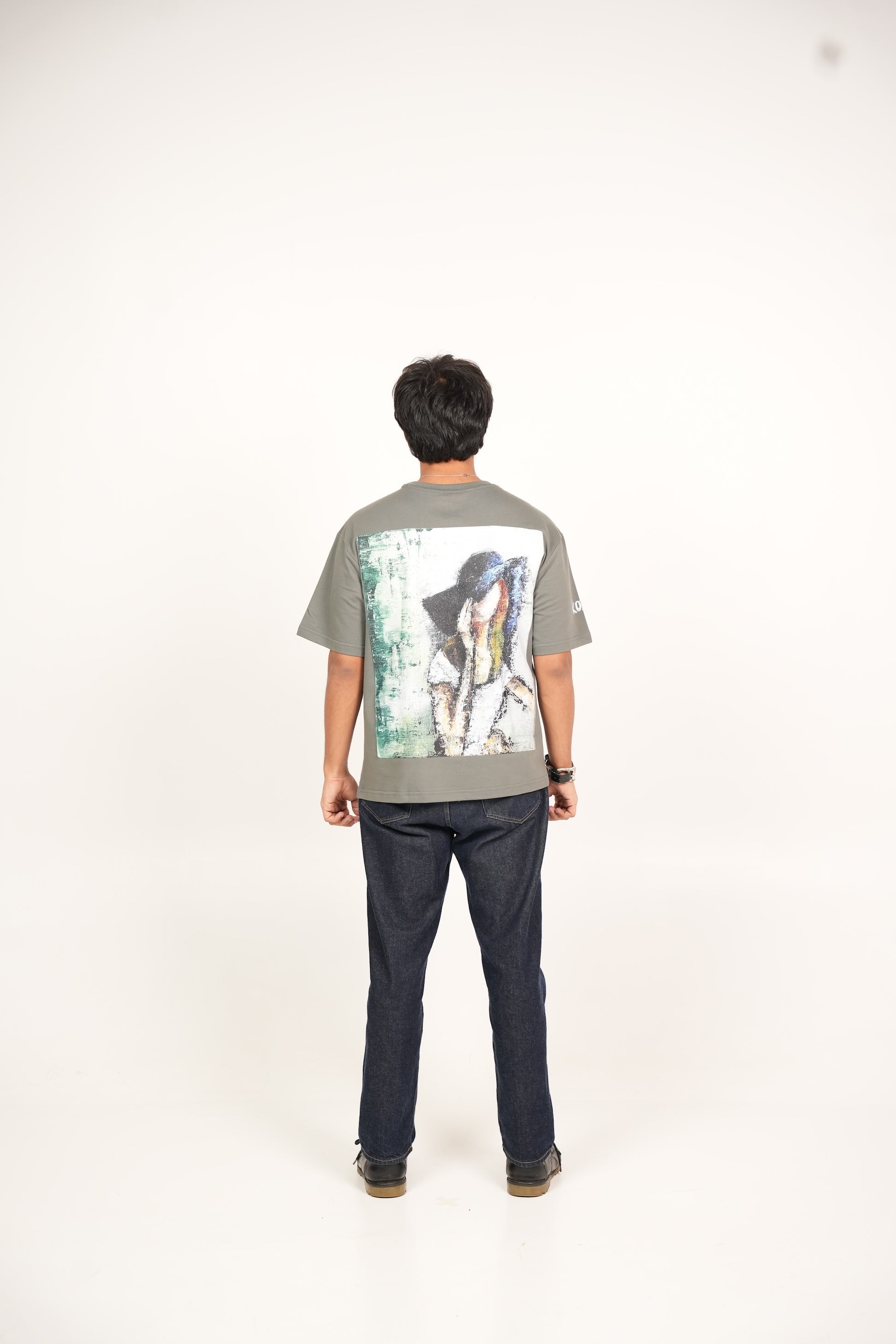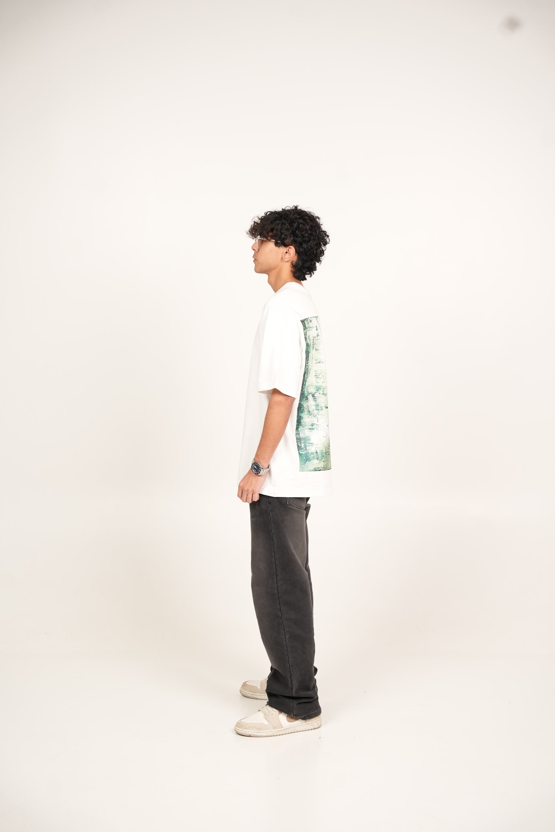 A hand-painted acrylic art piece with striking green knife painting strokes imprinted on an oversized fit t-shirt. Made with cotton, heavyweight and breathable.